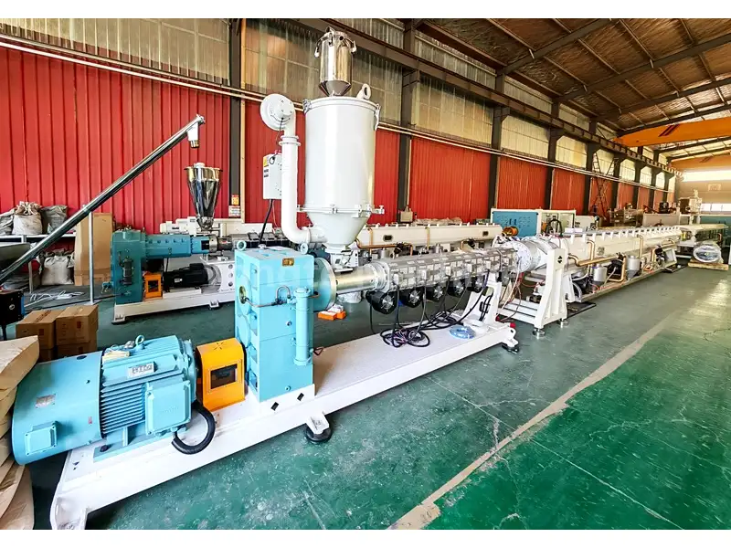 Nó sử dụng máy đùn trục vít đơn hiệu suất cao SJ75/33, với động cơ servo tiết kiệm năng lượng 75-90KW (cắt giảm mức sử dụng điện năng khoảng 20%), hộp số truyền động trực tiếp (để có hiệu suất truyền động tốt hơn và bảo trì dễ dàng hơn), thùng trục vít bền (được làm từ thép hợp kim 38CrMoALA với quá trình thấm nitơ chính xác), cuộn dây gia nhiệt hồng ngoại hiệu quả và điều khiển nhiệt độ tự động (sử dụng bộ điều khiển có độ chính xác cao của Omron). Tất cả các tính năng này phối hợp với nhau để giữ cho vật liệu nóng chảy ổn định, áp suất ép đùn đồng đều và chất lượng sản phẩm ổn định trong quá trình sản xuất.